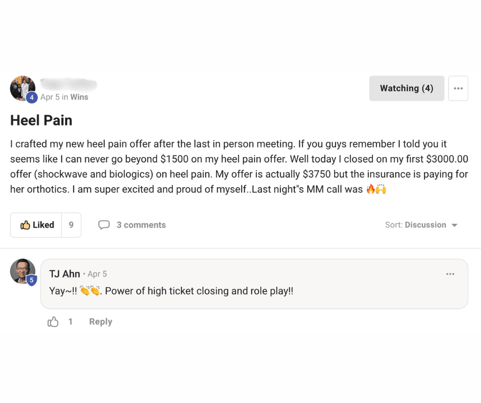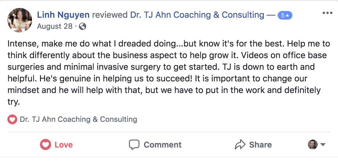 "Thank you for accepting me into your programs. I've learned a lot over the 2 years. I learned so much not only about improving my practice but also all aspect of your life. I absolutely recommend TJ's program to any colleagues who want to transform their practices"